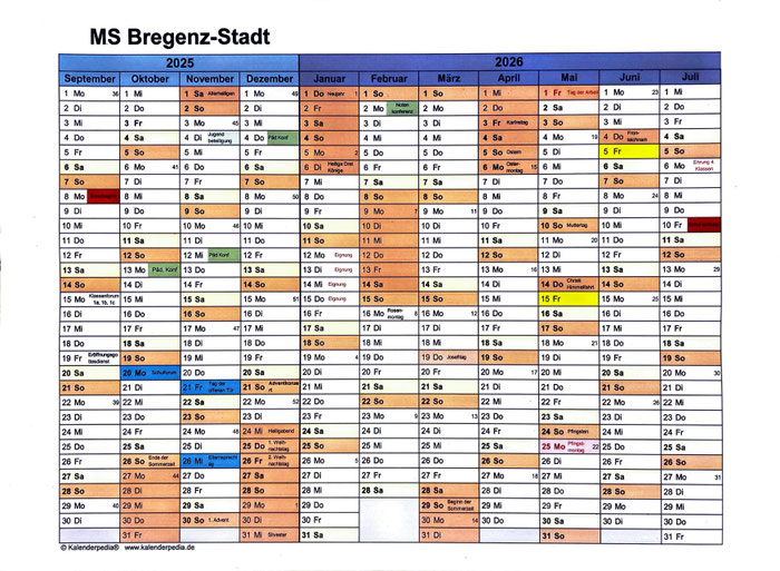 Aktueller Schulkalender für das Schuljahr 2025/26